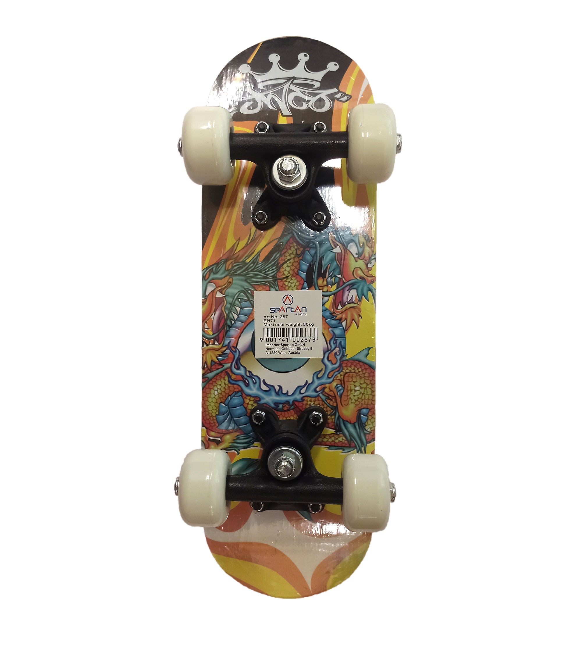 Indonézska 11 mm laminovaná doska, veľkosť mini (43 × 15 cm), kolieska z PVC 50 × 30 mm, štandardné ložiská (608z), plastové odpruženie. Možno používať do 50 kg telesnej hmotnosti.