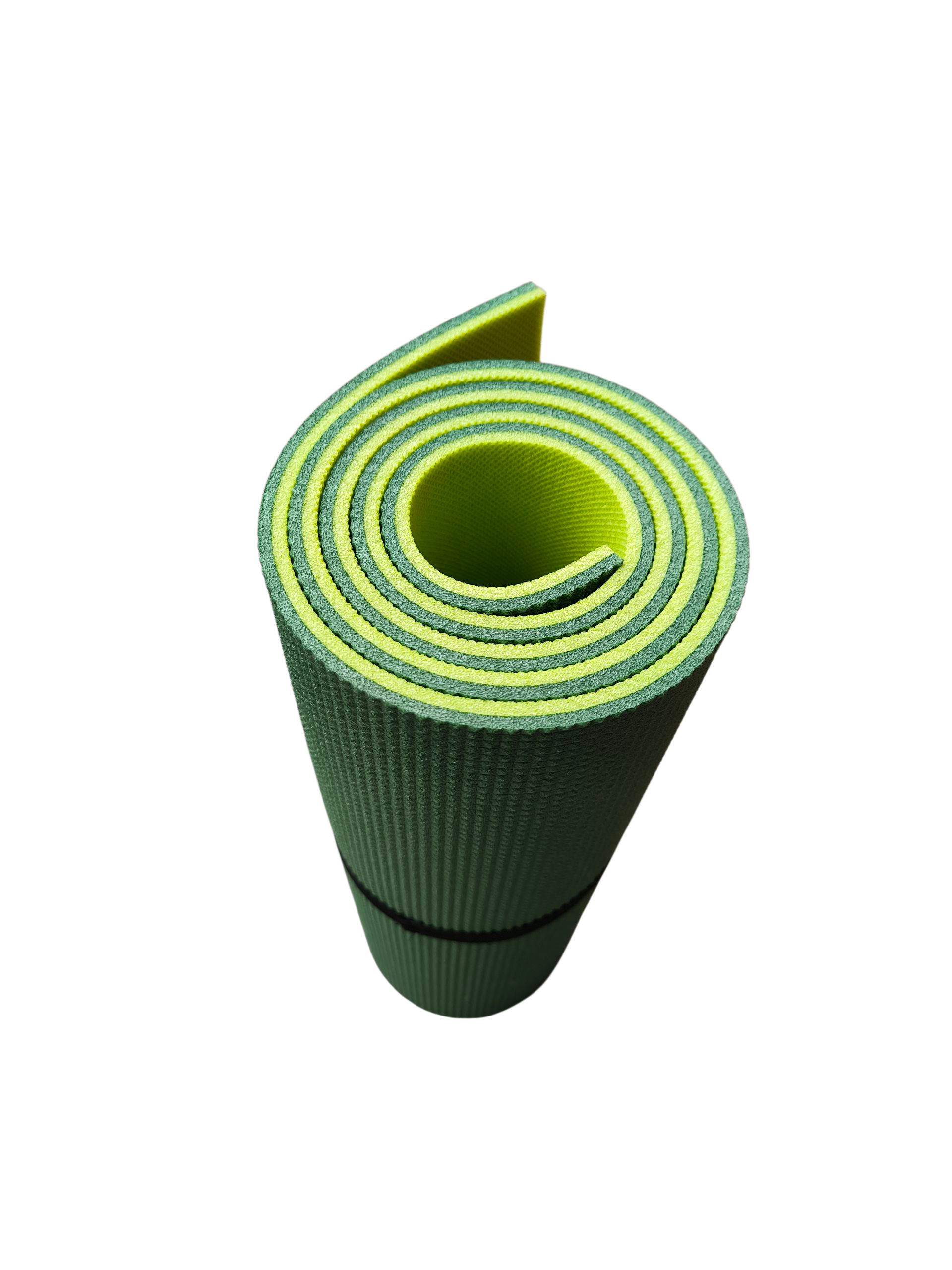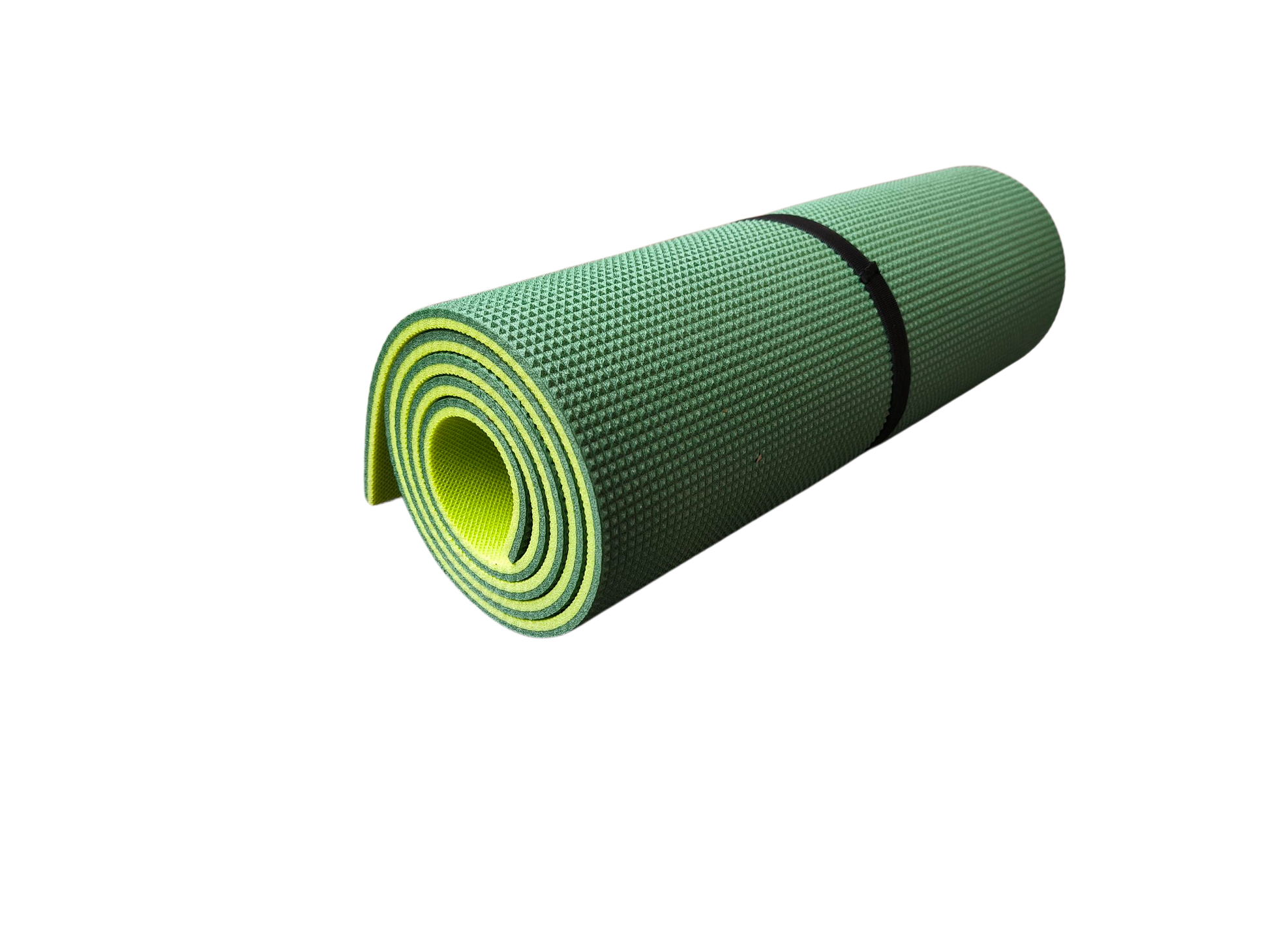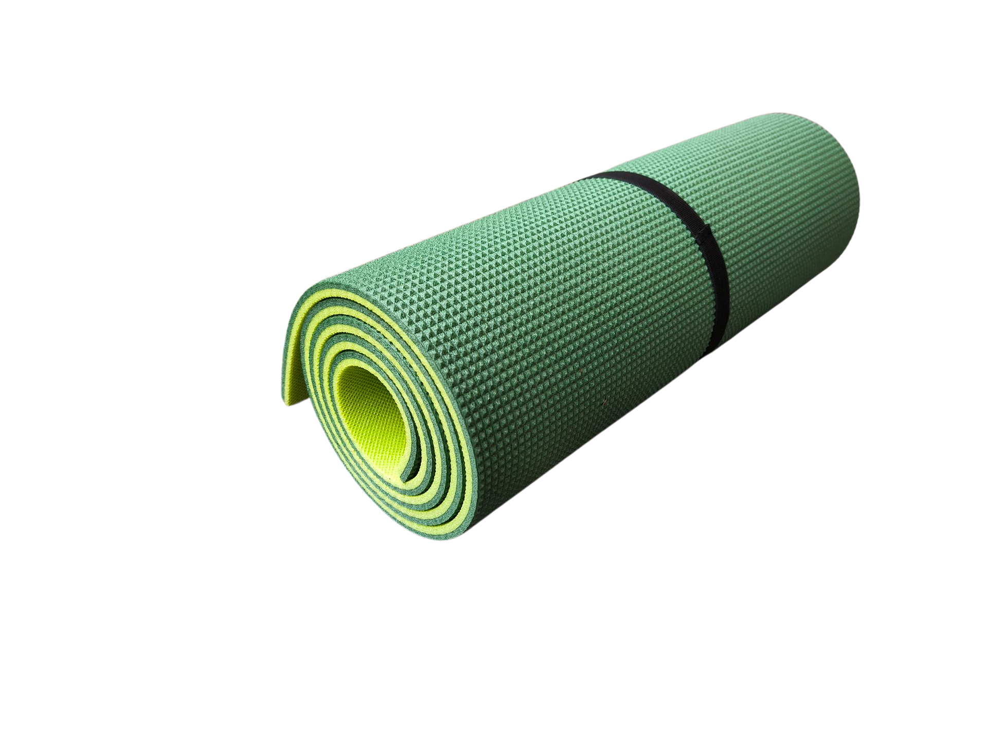 Rolovací penový matrac s reliéfnym povrchom, vhodný na opaľovanie a kempovanie, s fixačnou gumou. Jedna vrstva je tmavozelená, druhá svetlozelená.